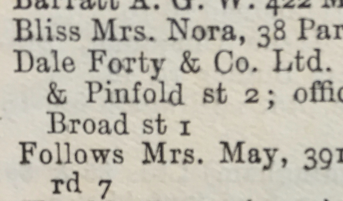 We first discover Dale Forty & Co. Ltd. in 1947, with evidence of three businesses open until 1952 but nothing showing in 1967 (we currently have a gap in our research). 80-84 New Street B2 Pinfold Street B2 Offices & Works 48 Broad Street B1