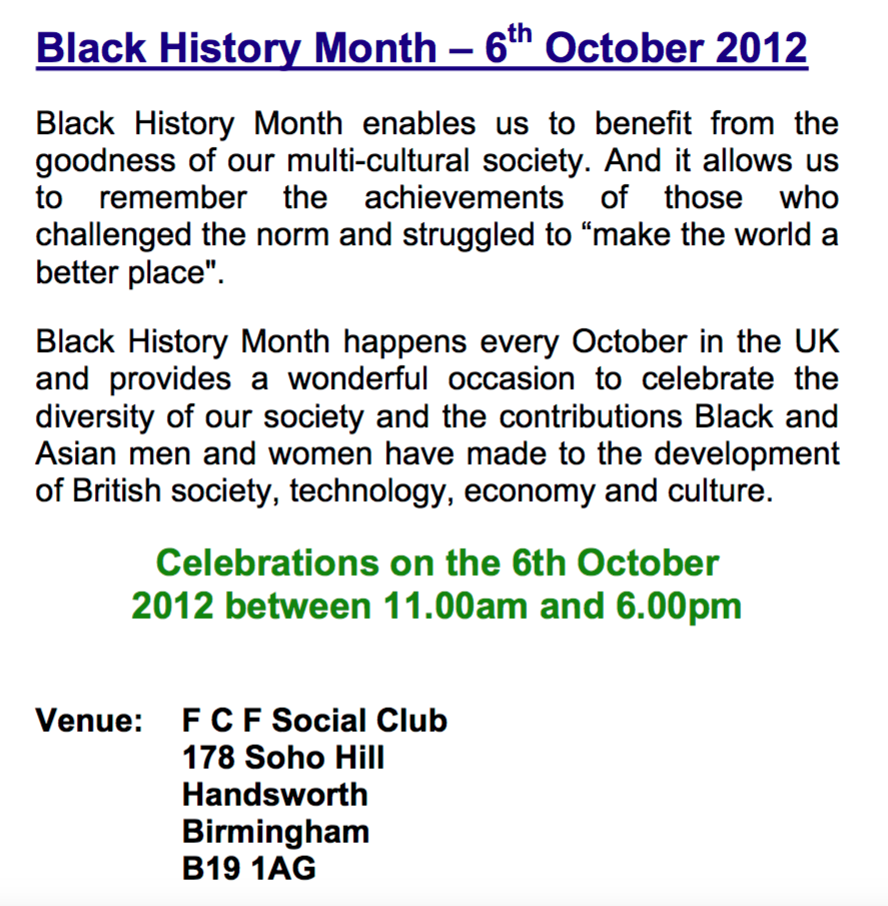 The club opened in September 1971 and has participated in Handsworth carnival, having stalls and floats, and continuing their support when it became Birmingham carnival.