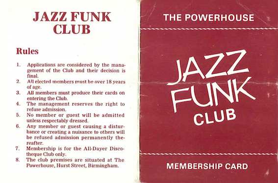 UK Vibe founder Steve Williams has sent in the membership card for the The Jazz Funk Club nights held at The Powerhouse.