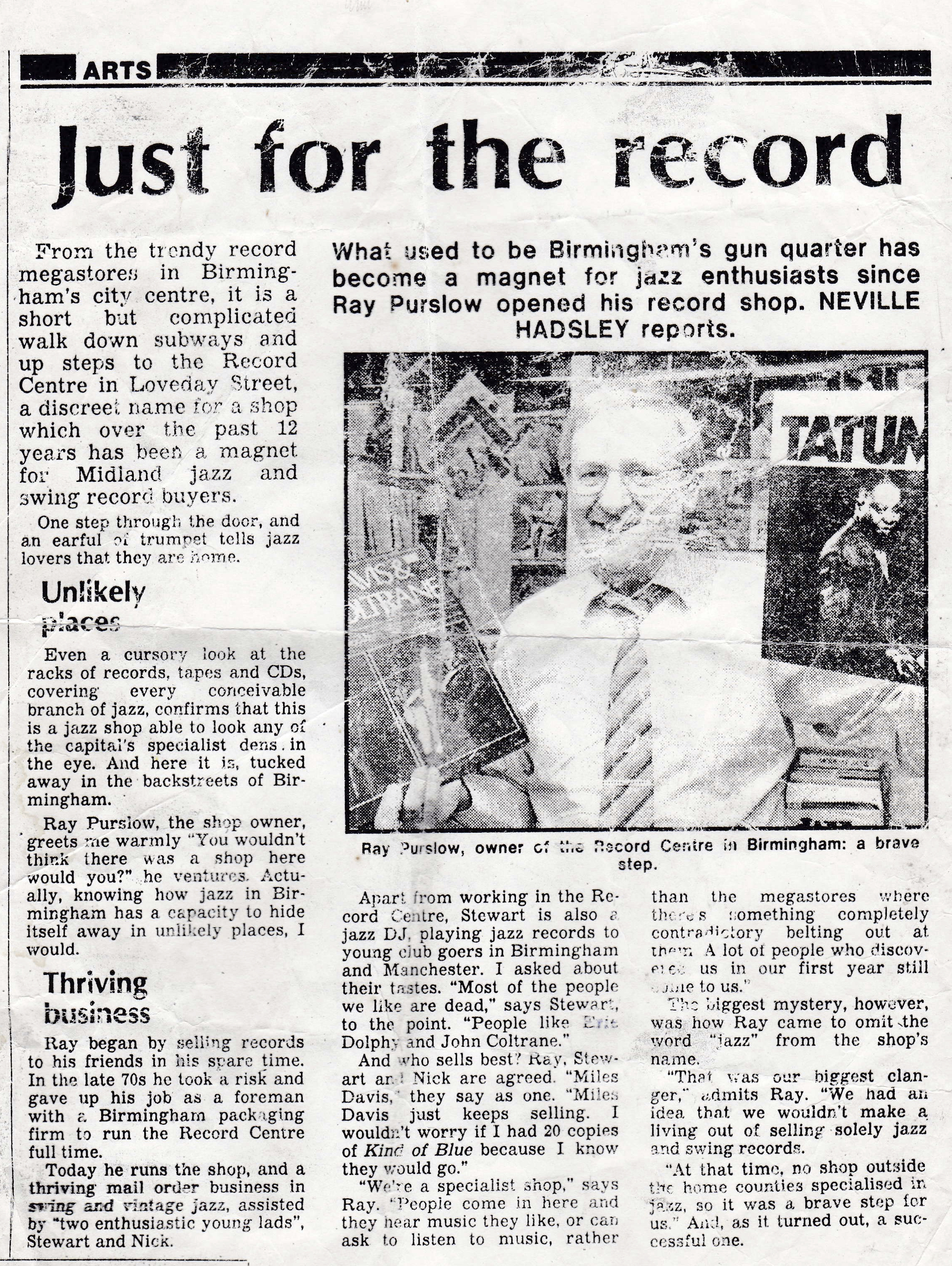 Also known as ‘Jazz & Swing’. Owner Ray Purslow opened the shop in October 1976 on Loveday Street in the Gun Quarter. It eventually closed in 2007.